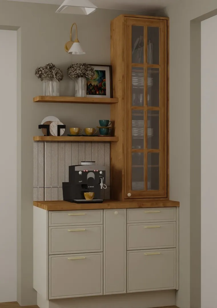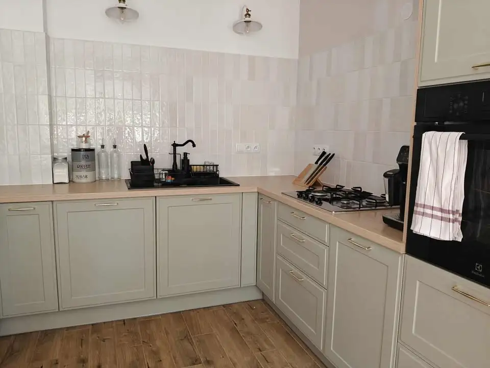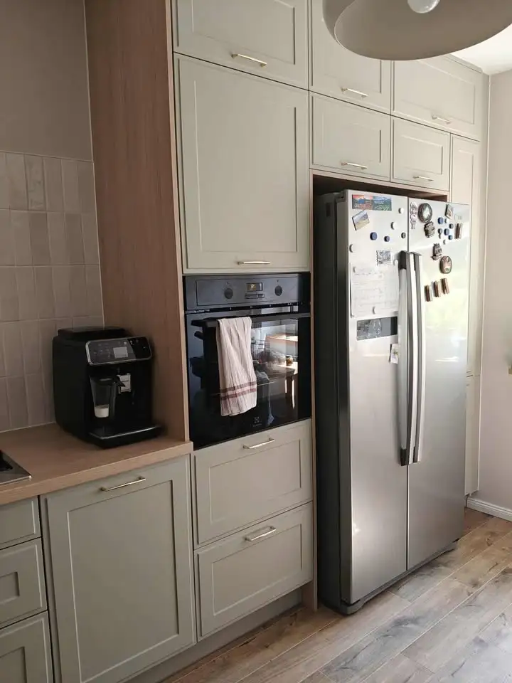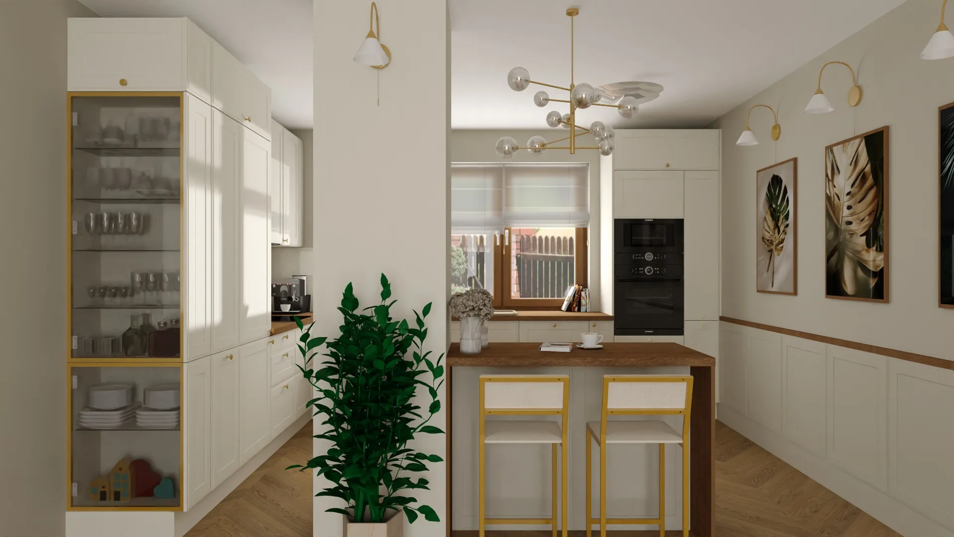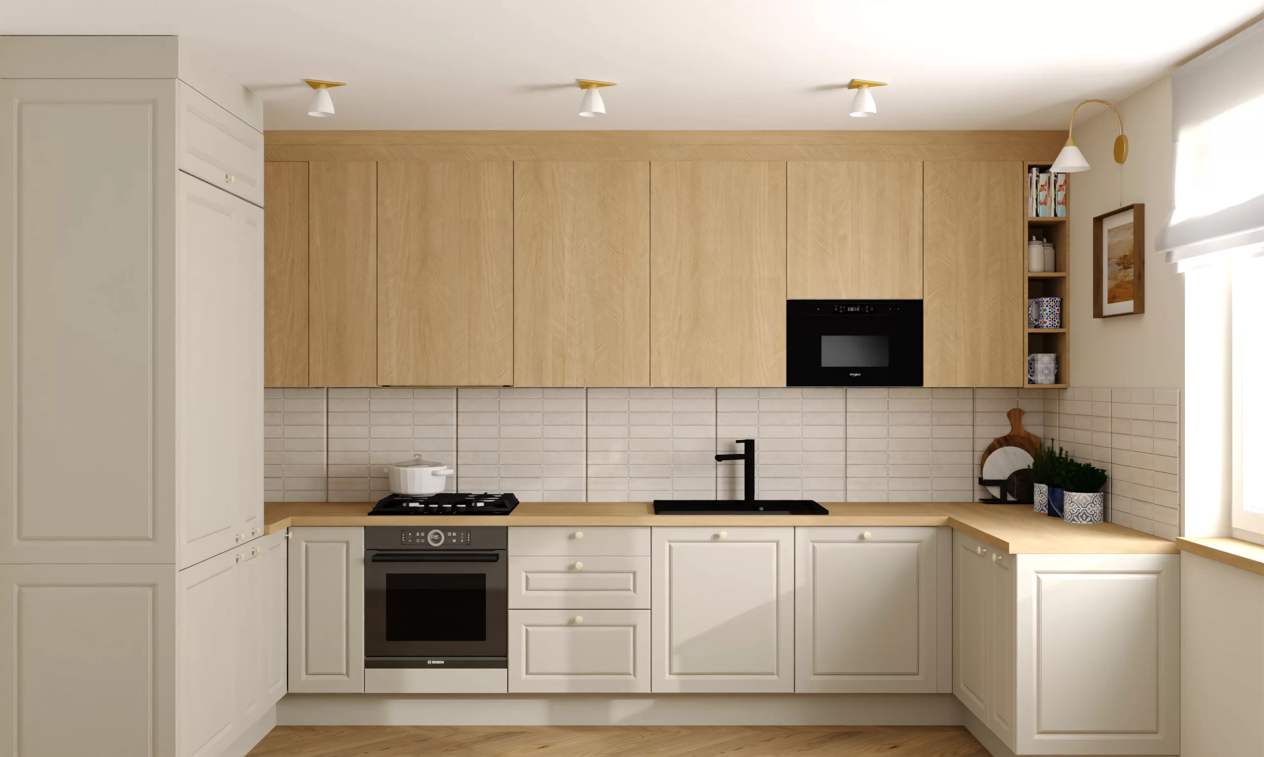 To idealna przestrzeń dla tych, którzy chcą połączyć nowoczesne udogodnienia z klasycznym, przytulnym klimatem. Kontrast między piekarnikiem w stylu retro a drewnianym kredensem tworzy niepowtarzalny charakter wnętrza.