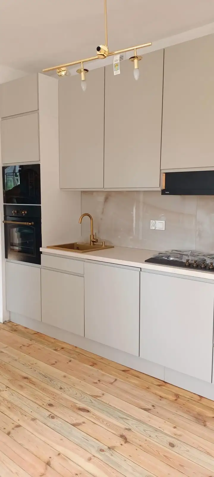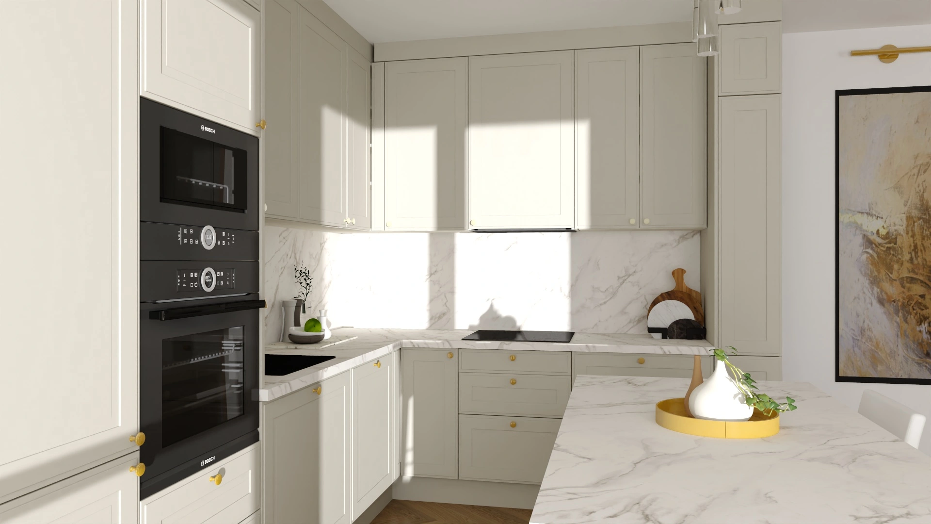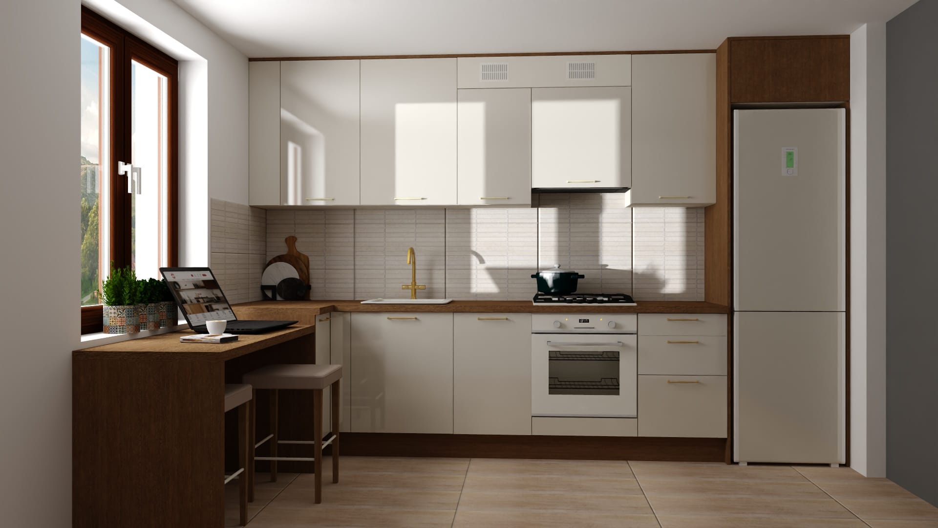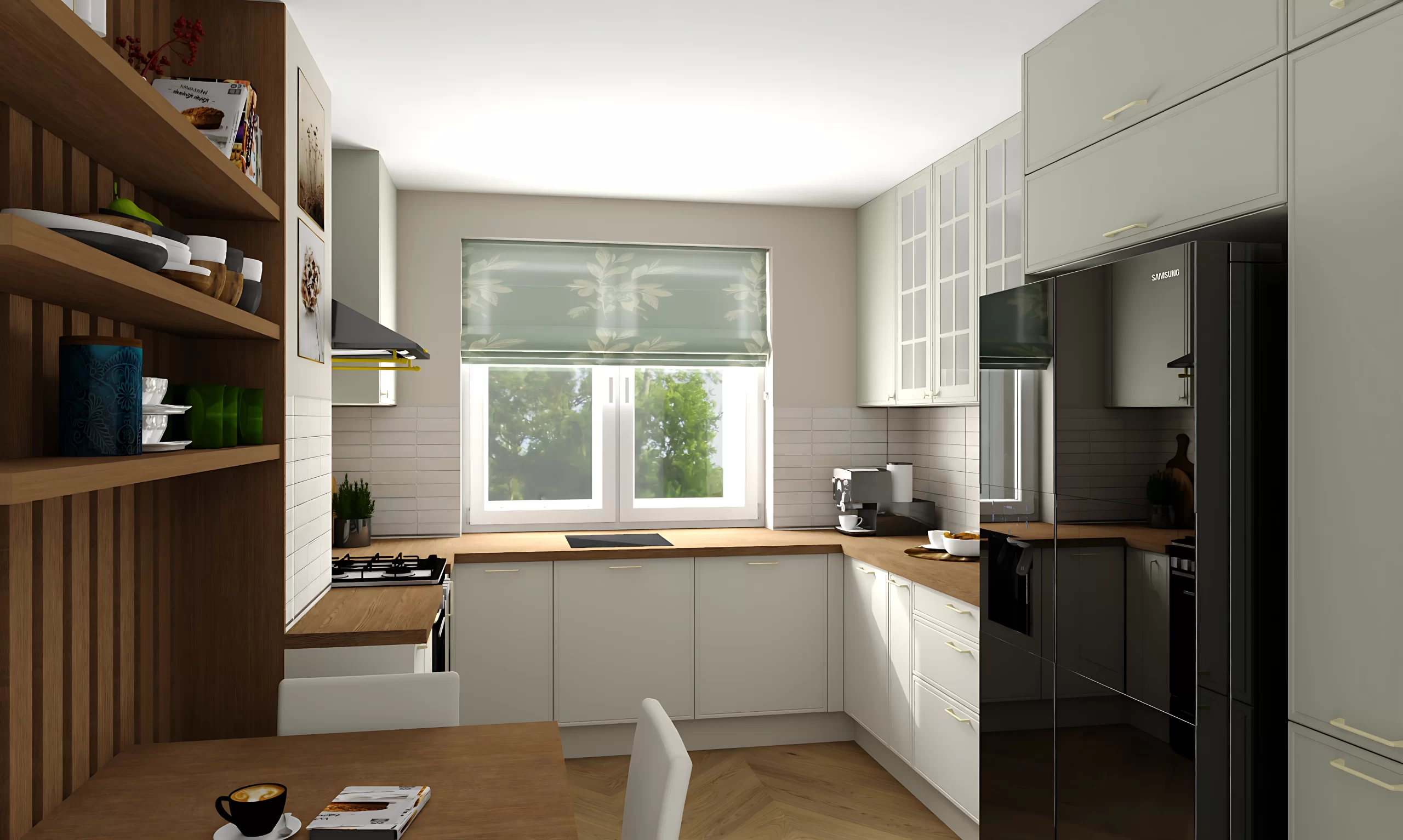 • Kolorystyka kuchni to białe meble, szare meble kuchenne i jasne kolory, które optycznie powiększają przestrzeń