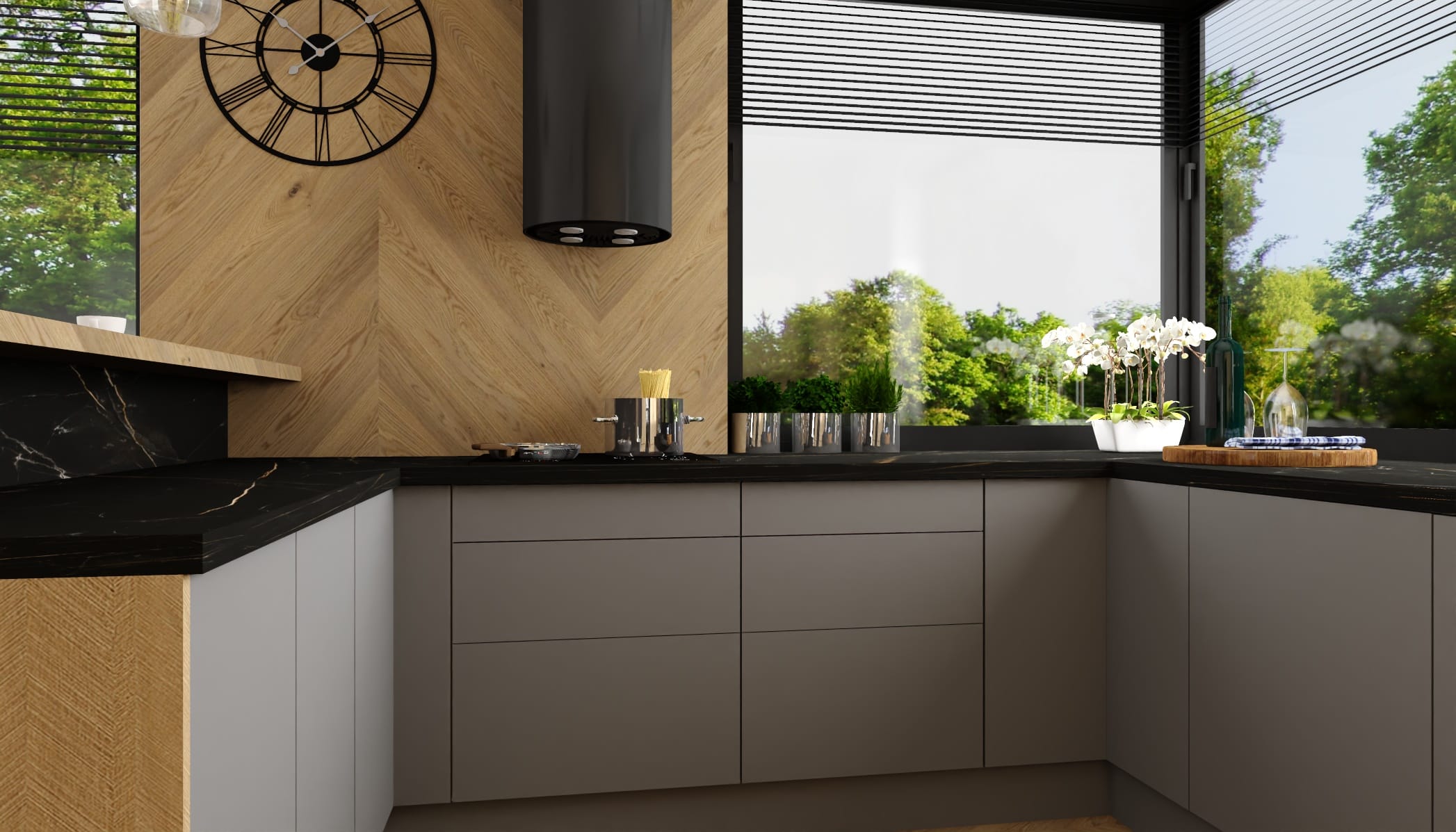 • Kolorystyka kuchni -stonowana – biała kuchnia, szara kuchnia, kuchnia kaszmir, czarne meble kuchenne