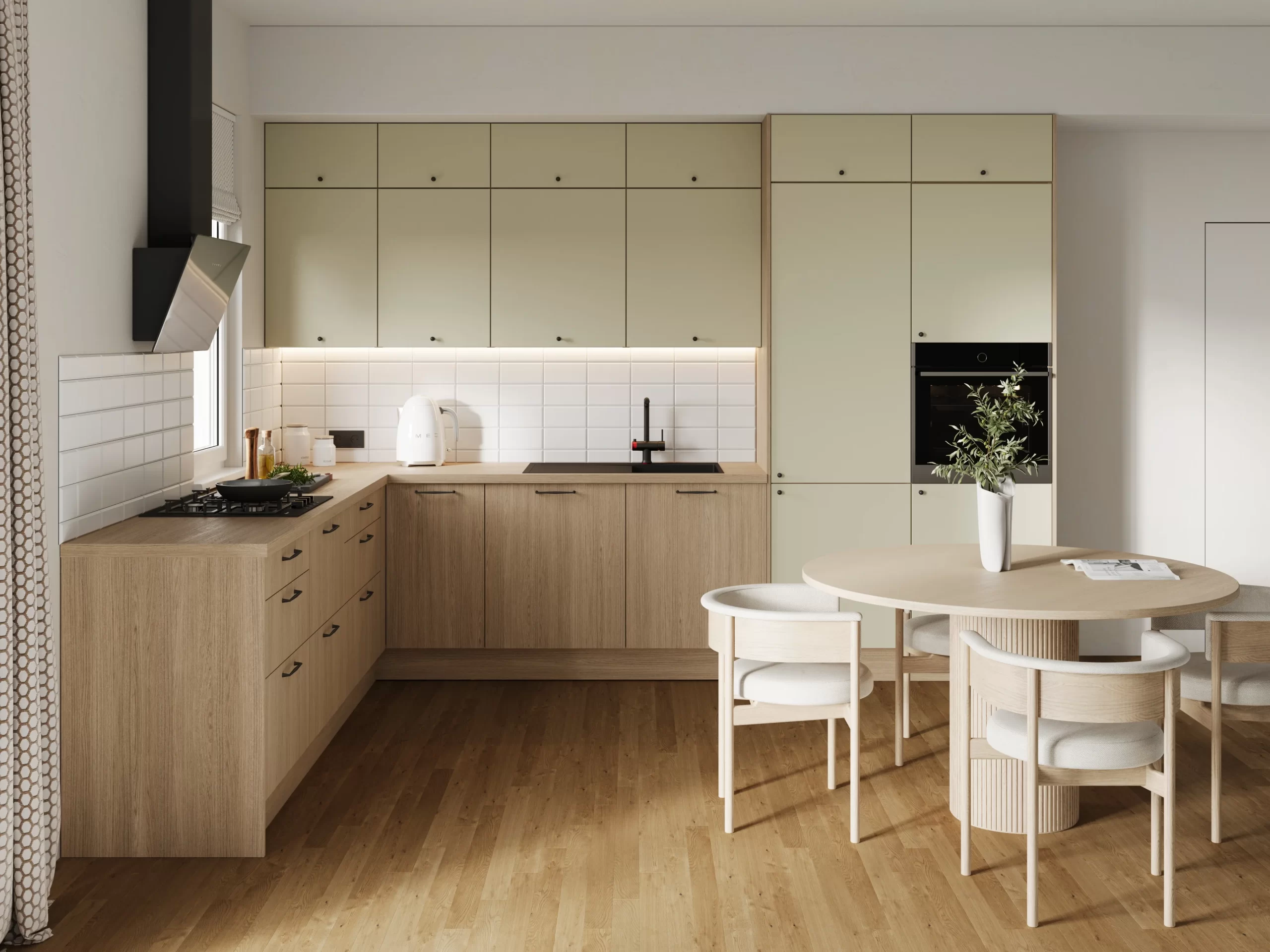Fronty: szałwia/oliwka | Blat: dąb średni | Dodatki: czarna bateria/uchwyty | Ściana: złamana biel