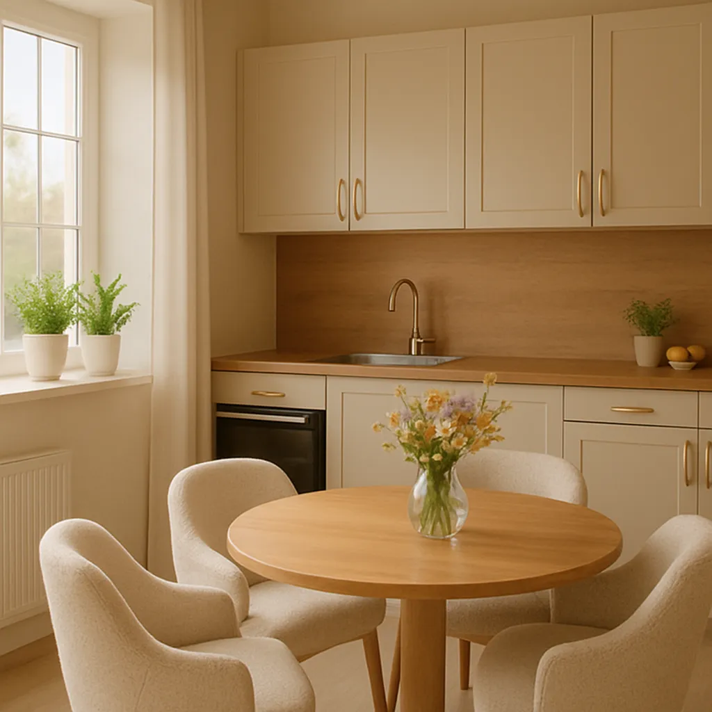 Kaszmir to ciepły, miękki beż z delikatną domieszką szarości, który wygląda „premium”, a jednocześnie jest bardzo łatwy do zestawiania. Najlepiej pasuje do jasnego i średniego drewna (dąb, jesion), blatów w ciepłych beżach oraz jasnych spieków/kwarców. Jeśli chcesz bardziej elegancki efekt – dobierz mosiądz/złoto; jeśli nowocześniejszy – czarne detale i proste oprawy oświetleniowe.