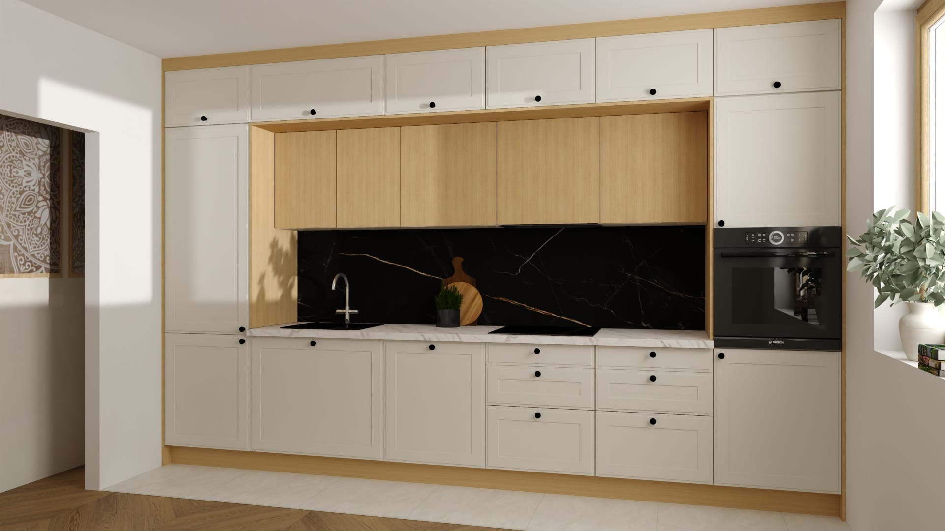 To najbardziej popularne zestawienie w aranżacji wnętrz. Kaszmirowe fronty kuchenne plus drewniany lub drewnopodobny blat stworzą ciepłą, uniwersalną do aranżacji przestrzeń.