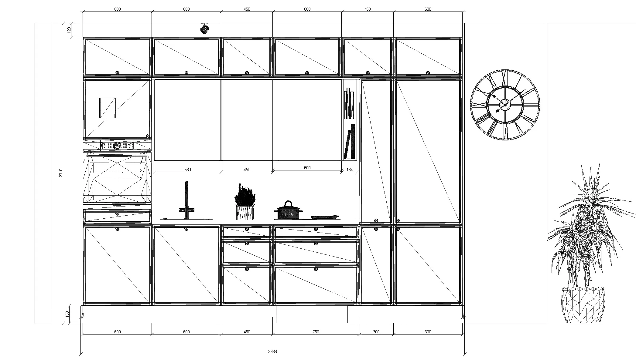- Wysoka zabudowa z wbudowanym piekarnikiem i szafkami sięgającymi sufitu – maksymalne wykorzystanie przestrzeni i elegancki, minimalistyczny design.