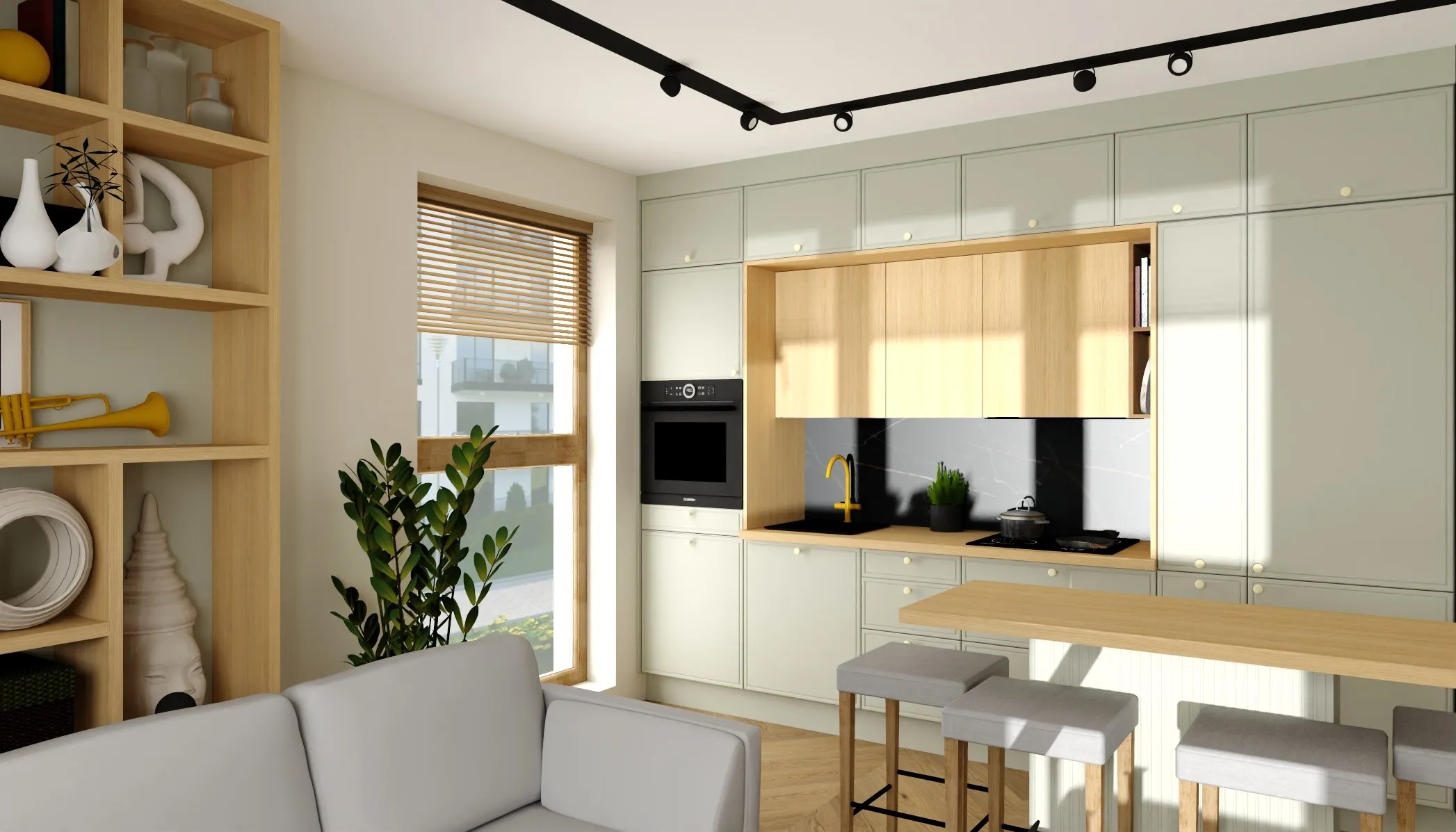 Dlaczego warto wybrać kuchnię otwartą z salonem w delikatnej oliwkowej zieleni?