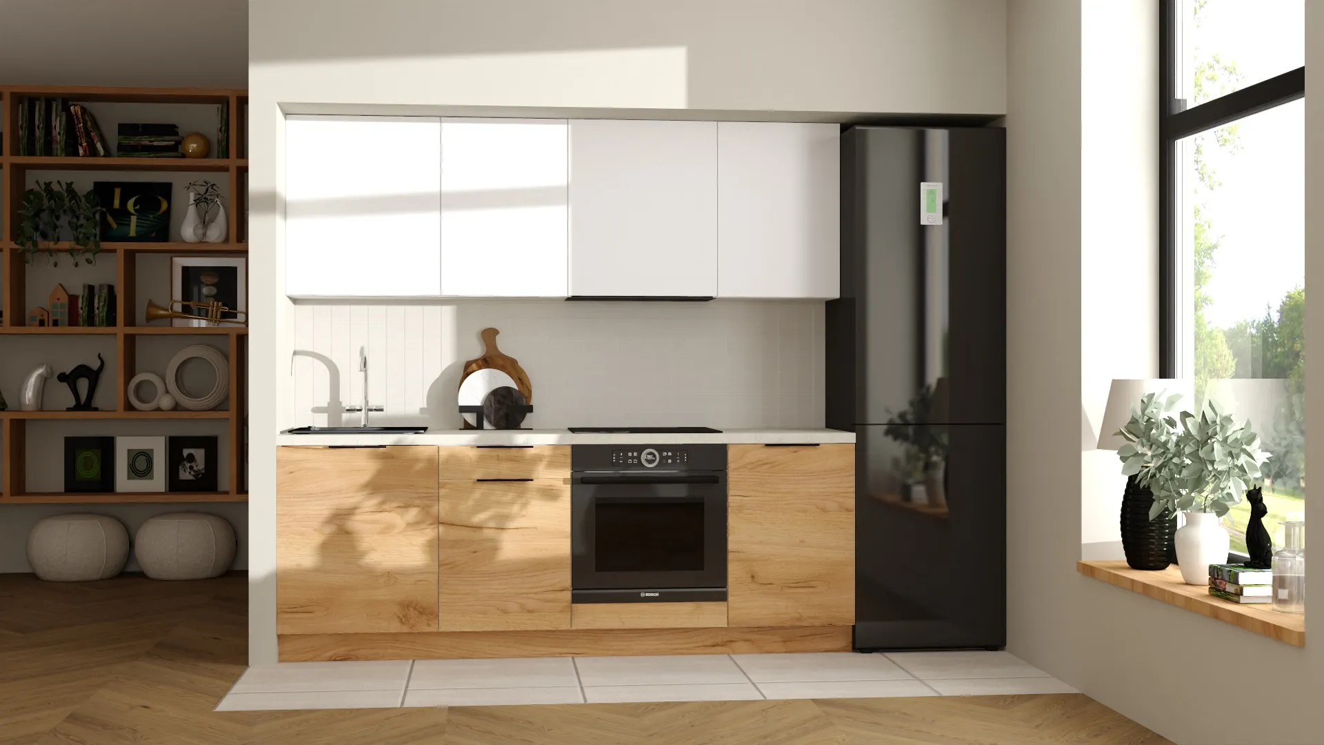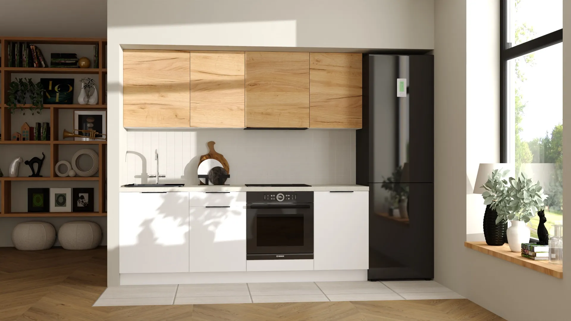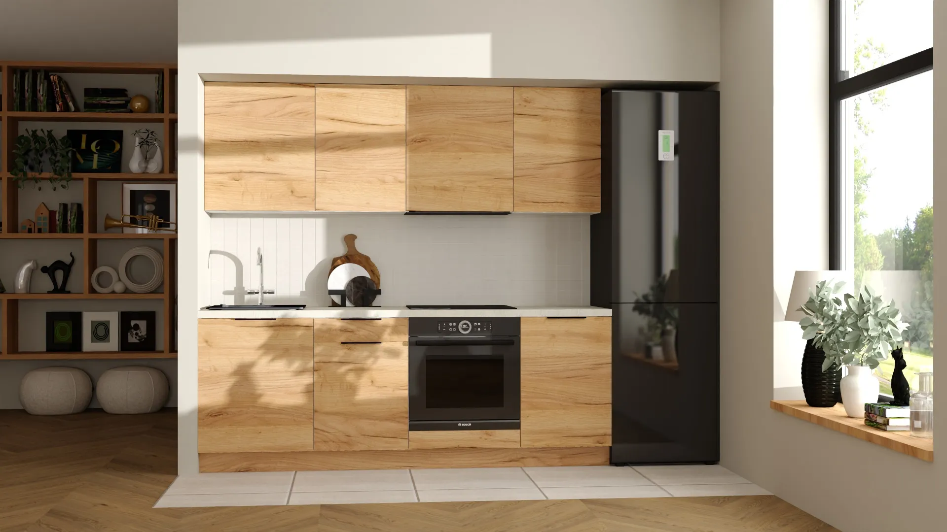zawiera szafki dolne i szafki wiszące, w tym również szafkę zlewową 60 cm. Ponadto szafkę do zabudowy piekarnika, żeby kuchnia nabrała nowoczesnego charakteru. Blat nie wchodzi w skład prezentowanego zestawu, ale istnieje możliwość dokupienia go w naszym sklepie.