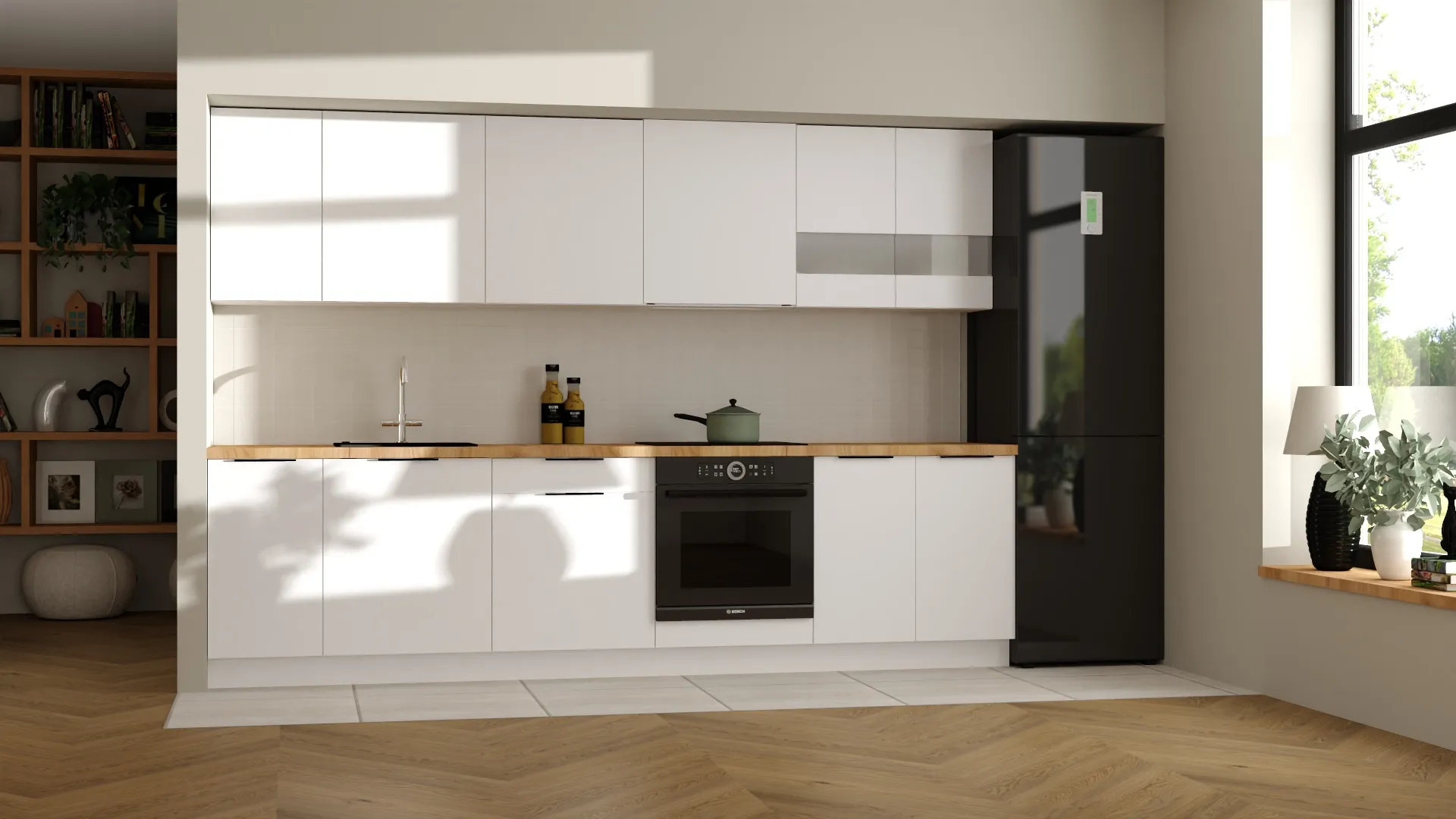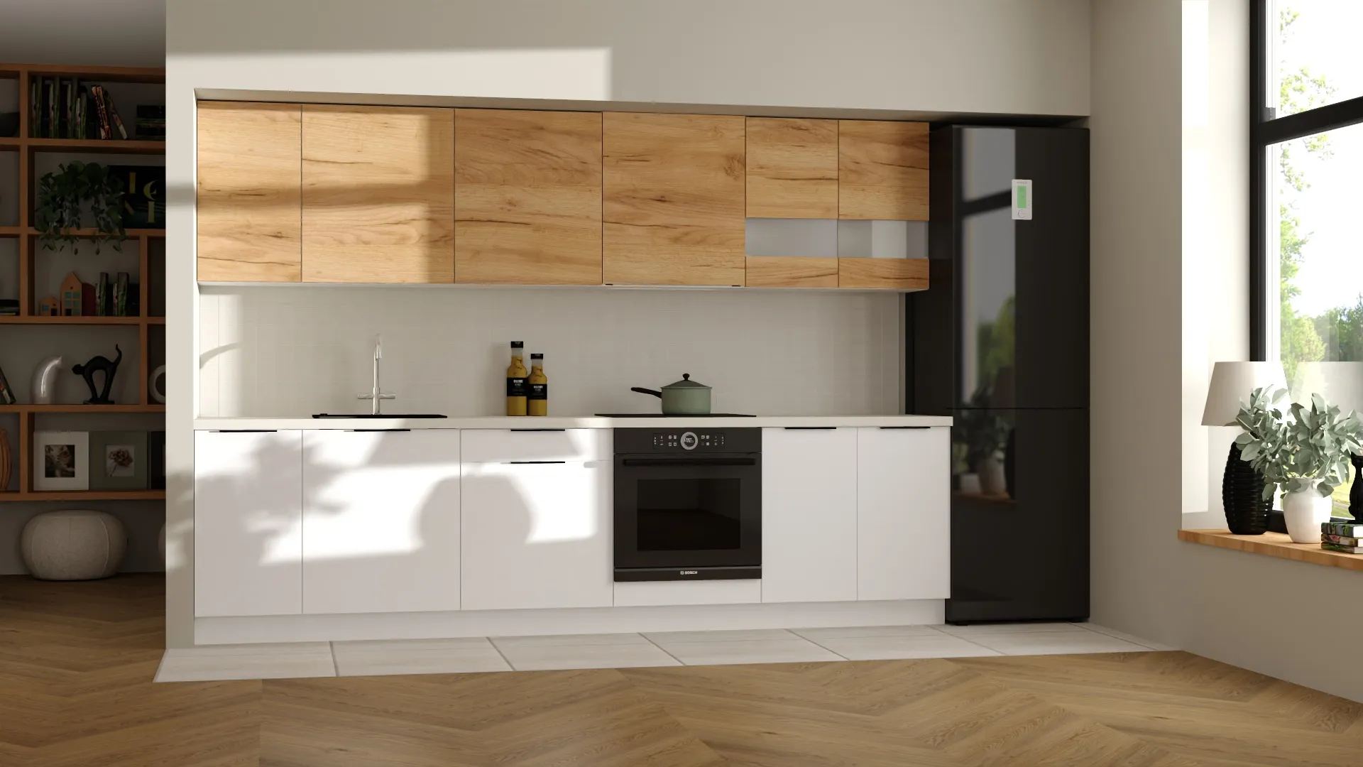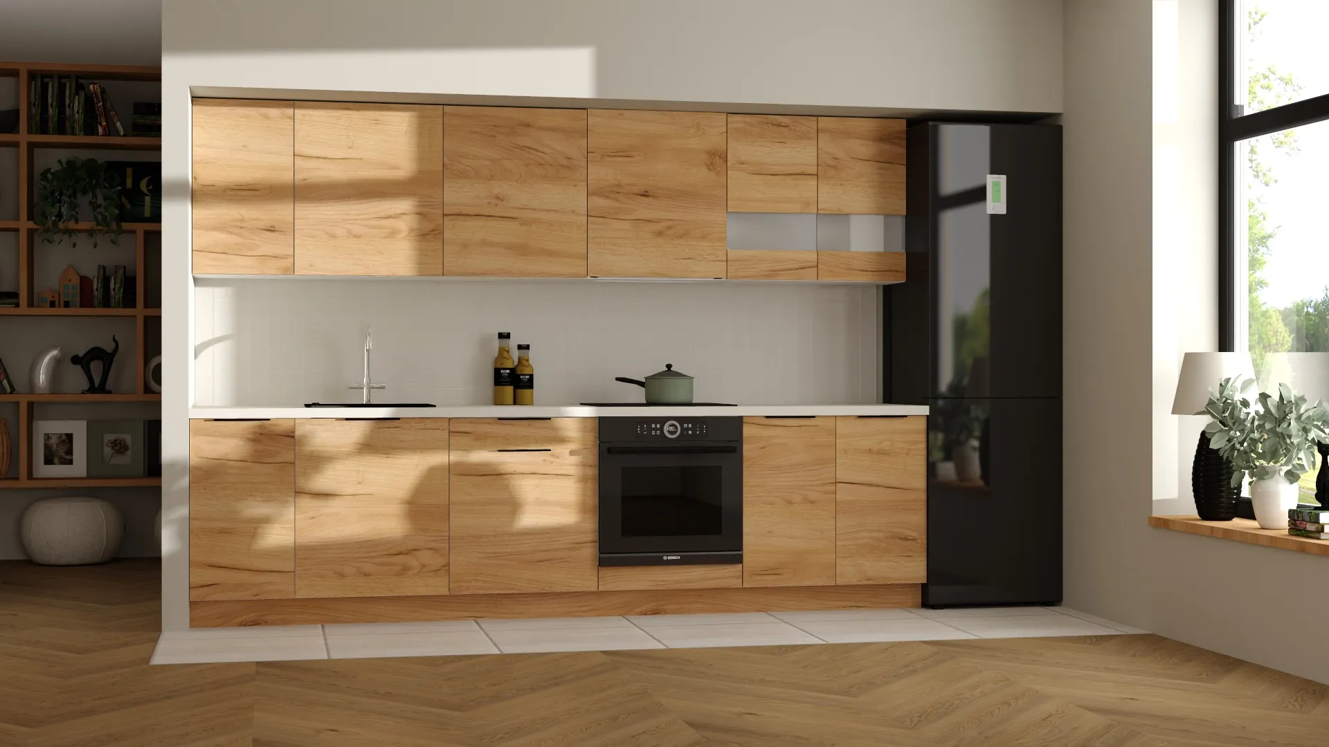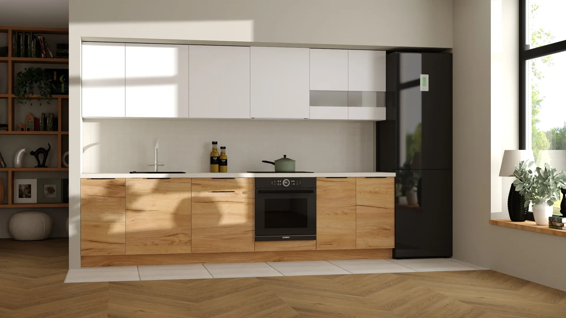 Zestaw mebli kuchennych o długości 300 cm to idealna propozycja dla tych, którzy szukają praktycznej i atrakcyjnej cenowo kuchni od cenionego polskiego producenta KAM. Dostępny w dwóch wersjach kolorystycznych – możesz wybrać klasyczną biel lub zestawić biały platynowy z ciepłym odcieniem dębu złotego, tworząc niepowtarzalny design dopasowany do własnych preferencji. Istnieje również możliwość wykonania kuchni w całości w kolorze dąb złoty. Decyzja należy wyłącznie do Ciebie!