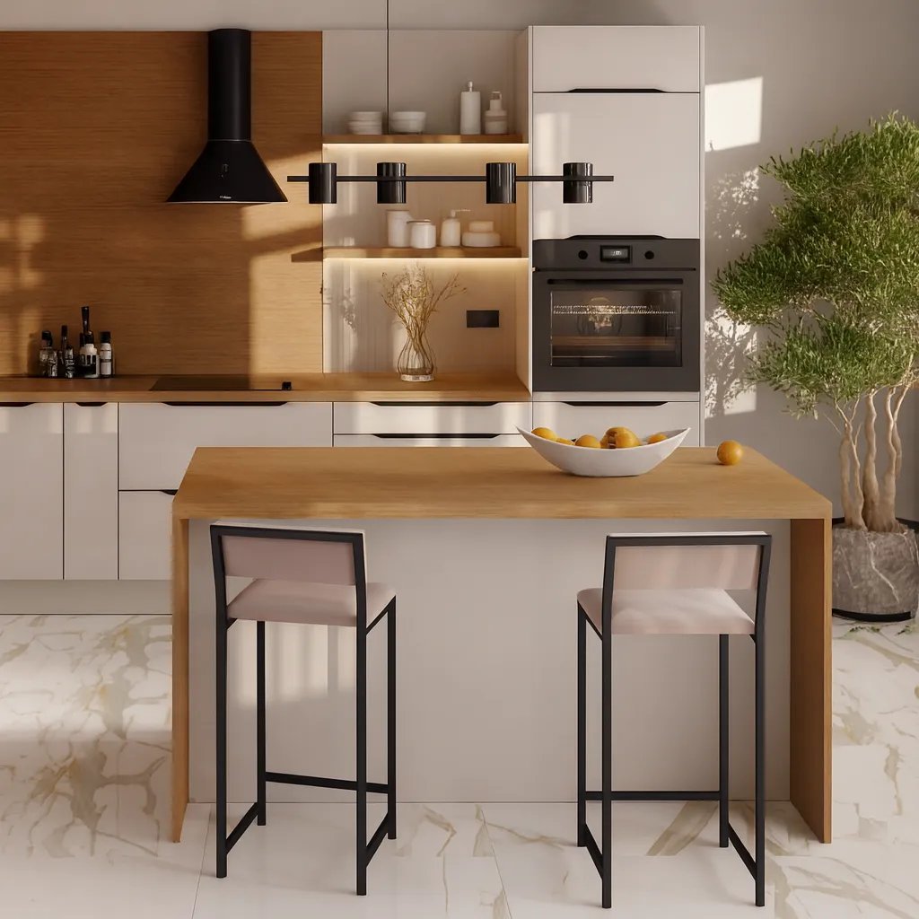 Głębokość blatu 80 cm w połączeniu z głębokością korpusów 51 cm pozwala czytelnie rozdzielić stronę roboczą od strony „frontowej”. Wyspa może współpracować z zabudową w systemie KAM MONO, ale może też uzupełniać inne zestawy mebli kuchennych – np. jako później dobudowana wyspa kuchenna w już urządzonej kuchni. W zależności od przyjętego wymiaru wewnętrznego, element może pełnić funkcję dodatkowego blatu roboczego, miejsca na hokery lub prostego bufetu między kuchnią a jadalnią.
