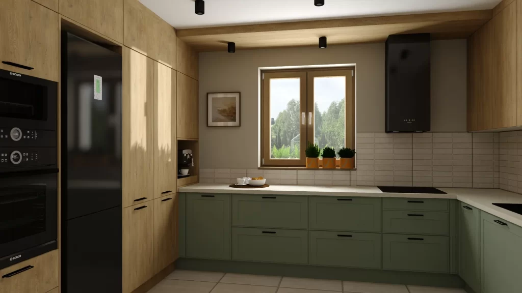 - Kuchnia z zabudową meblową – integracja spiżarni z meblami
